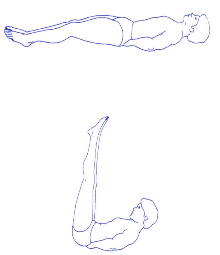 Para este ejercicio, túmbese boca arriba, con los pies juntos, sobre una superficie plana. Debe mantener las palmas de las manos hacia abajo, con los dedos juntos, y las manos ligeramente inclinadas hacia el centro del cuerpo (vea el dibujo que figura de la derecha). Levante las piernas del suelo hasta que queden rectas hacia arriba o, mejor aún, hasta que hayan sobrepasado un poco el centro. Al mismo tiempo, levante la cabeza hasta que la barbilla toque el pecho. Luego, lentamente, vaya bajando las piernas y la cabeza, y relájese. Realice este ejercicio tantas veces como pueda, pero no se fuerce. Su objetivo será repetirlo 21 veces. No doble las rodillas, pero, si no puede usted hacerlo ni una vez, vea cuántas veces puede hacerlo con las rodillas dobladas.• Giro sentido contrario agujas del reloj, quita energía negativa (Ábrete Sésamo)