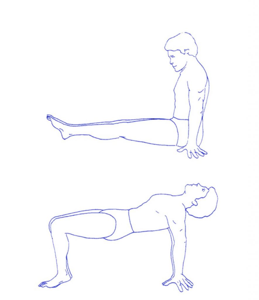 Siéntese sobre una superficie plana, con los brazos a ambos lados del cuerpo y las palmas apoyadas en el suelo. Ahora, levante el cuerpo y doble las rodillas hasta que su torso parezca una mesa sostenida sobre sus brazos y sus piernas. Antes de levantar el cuerpo, su barbilla deberá estar tocando el pecho. A medida que lo levante, deberá dejar que caiga suavemente hacia atrás (vea el dibujo). Recupere la posición original. Como en los demás ritos, su objetivo será repetir el ejercicio 21 veces.